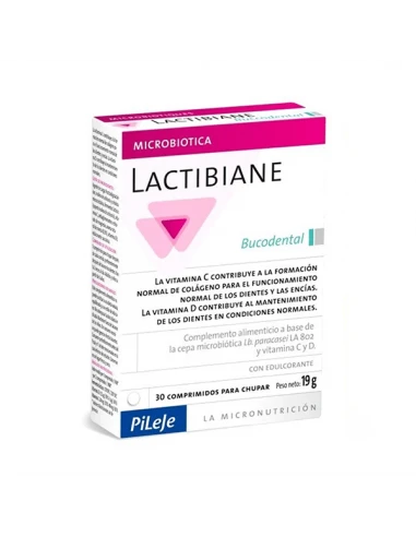 Lactibiane Bucodental 30 comprimidos para chupar se trata de un complemento a base de Lactobacillus Paracasel y Vitaminas C y D, que ayudan a prevenir enfermedades periodontales y garantizan el correcto funcionamiento de dientes y encías. Es ideal para mantener la salud bucodental.