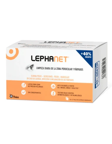 Los microorganismos,el polvo o el polen son agentes agresivos externes que puede conllevar problemas oculares tales como alergias,sequedad,irritación o infecciones oculares como blefaritis u orzuelos que van acompañados de síntomas tales como sequedad,picor,dolor y sensación de arena en los ojos. Para poder conservar una higiene óptima de los párpados se aconseja el uso de productos como las toallitas oculares que proporcionan un cuidado adecuado de los ojos. Lephanet son unas toallitas oculares impregnadas y estériles que facilitan la eliminación de secreciones,suaviza y regenera. Está indicado en casos de blefaritis,orzuelos e infección ocular ya que contiene Capriloilglicina que actúa como antibacteriano específico de las bacterias que suelen provocar infecciones oculares. Además limpian en profundidad e hidratan ya que contienen Ácido hialurónico y vitamina A y favorecen la cicatrización reparando el párpado gracias a su contenido en extracto de Centella asiática. Su contenido en Iris florentina contribuye a regular la producción de sebo de las glándulas parpebrales. Gracias a sus propiedades,también pueden ser empleadas antes y-o después de cirugías oculares.