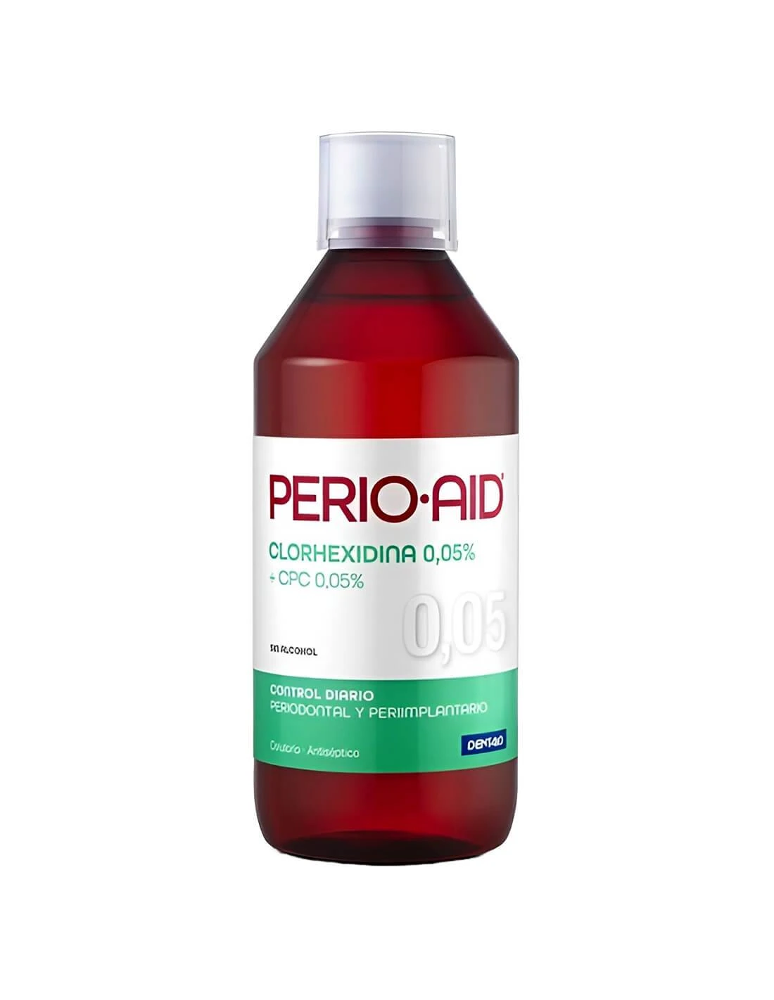 Perio Aid Colutorio Mantenimiento 500 ml se trata de un enjuague bucal a base de Clorhexidina (0,05%) y Cloruro de Cetilpiridino (0,05%), que contribuye a evitar la formación de la caries y la placa bacteriana. Ideal después de una intervención quirúrgica.
