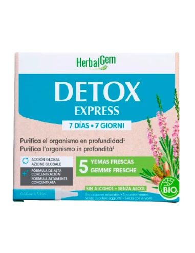 Este detoxificante express en forma de 7 cómodas ampollas contiene 5 yemas para purificar el organismo en profundidad.