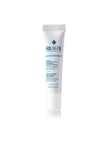 RILASTIL HYDROTENSEUR CREMA CONTORNO OJOS 15 ML es una crema ideal para empezar a revertir y prevenir todos los signos de la edad en el contorno de ojos. A base de tres tipos de ácido hialurónico y el tetrapéptido-5 trata y rellena arrugas, hidrata en profundidad, descongestiona bolsas y corrige el color oscuro de las ojeras.