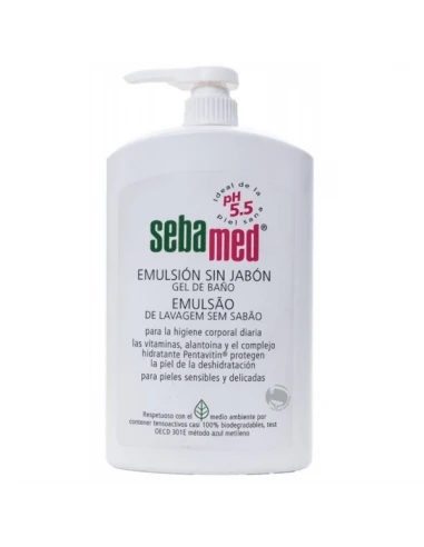 SEBAMED EMULSION 1000 ML es un gel de baño sin jabón para la higiene diaria. Gracias a la alantoina, vitaminas y un complejo hidratante llamado Pentavitin limpia en profundidad y previene de la deshidratación y la irritación. pH=5,5. 100% biodegradable.
