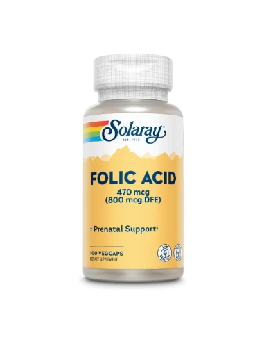 SOLARAY ACIDO FOLICO 800 MCG 100 VEGCAPS es un complemento alimenticio que contiene la vitamina b9 o ácido fólico indispensable para la salud cardiovascular y el desarrollo del feto. Se recomienda en embarazadas o en planificación de la concepción así como para reducir los niveles de homocisteína en sangre.